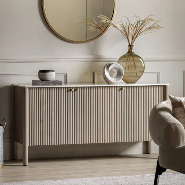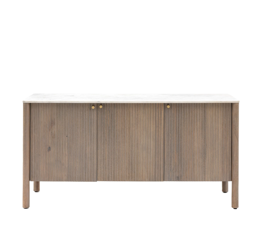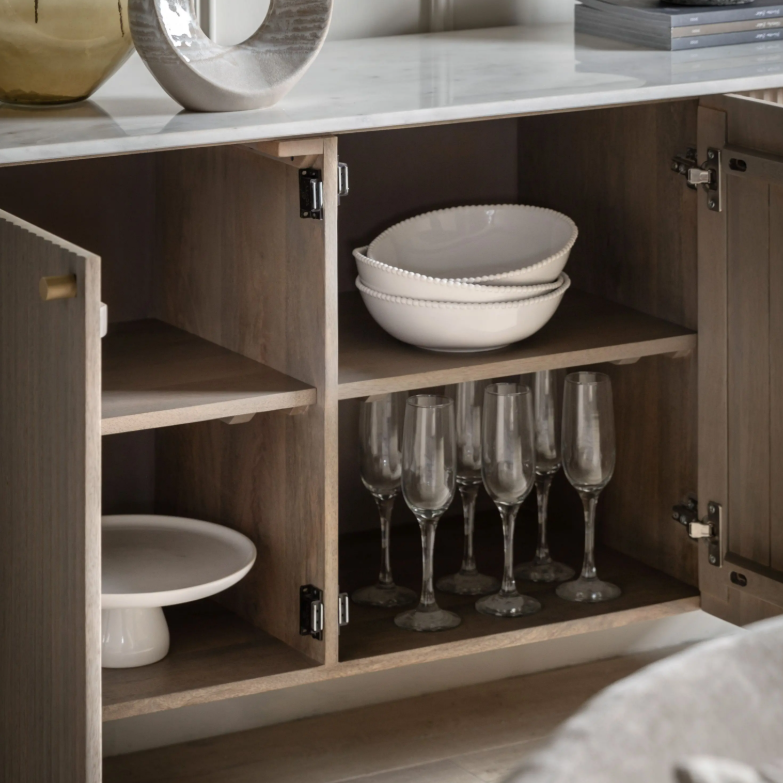 Ta zachwycająca komoda o nowoczesnym, klasycznym wyglądzie emanuje ponadczasową jakością i pięknem, oferując jednocześnie praktyczne rozwiązanie do przechowywania. Wykonana jest z litego drewna mango, z efektownym, pionowym ryflowaniem na drzwiach i polerowanym, białym blatem z indyjskiego marmuru Carrera z klasycznymi, szaro-niebieskimi żyłkami. Dostępne są również pasujące elementy.
