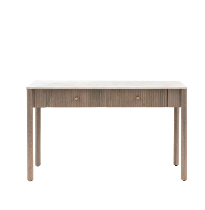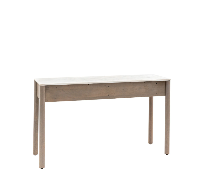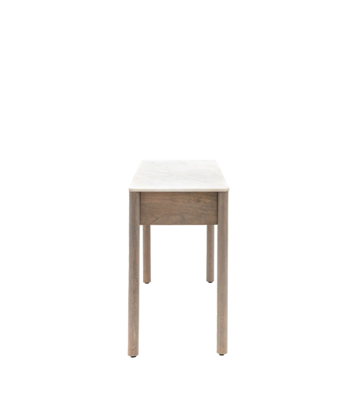 Ten modny stolik konsolowy oferuje nowoczesny, klasyczny wygląd. Wykonany z litego drewna mango, z efektownym pionowym żebrowaniem na szufladach . Konsola posiada polerowany biały blat z indyjskiego marmuru Carrera z klasycznymi, szaro-niebieskimi żyłkami. Stolik ten emanuje ponadczasową jakością i pięknem. Dostępne są pasujące elementy.