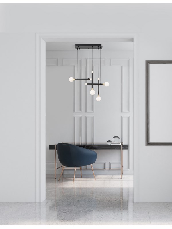 Lampa sufitowa nawiązująca swoją stylistyką do stylu Mid Century Modern Lampa składa się z 5 czarno złotych elementów w kształcie walca zakończonych niewielkimi szklanymi – mlecznymi kloszami. Bardzo oryginalna lampa sufitowa.