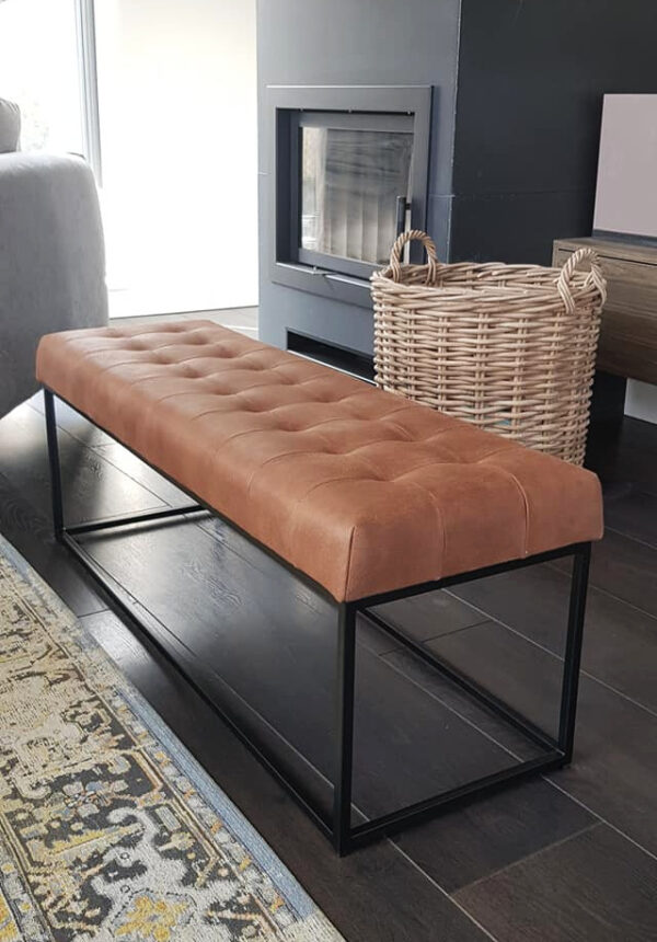 Solidnie wykonana ławka tapicerowana na stalowym stelażu. Siedzisko wykonane z wysokiej jakości pianki tapicerskiej. Tkanina wierzchnia to skóra w 90% naturalna. Dzięki dodatkom skóra ma naturalny wygląd ale jest mocniejsza na uszkodzenia i odporniejsza na zabrudzenia. Mimo wszystko posiada naturalny wygląd. Ławkę możemy dostosować rozmiarem do indywidualnych potrzeb kupującego. Wtedy prosimy o kontakt w tej sprawie i o wycenę.