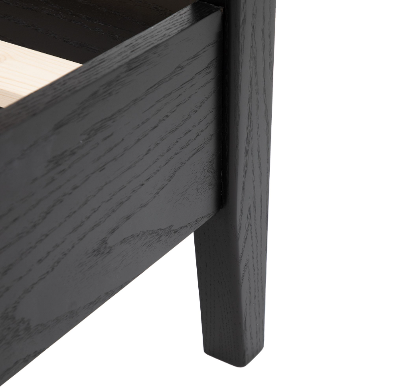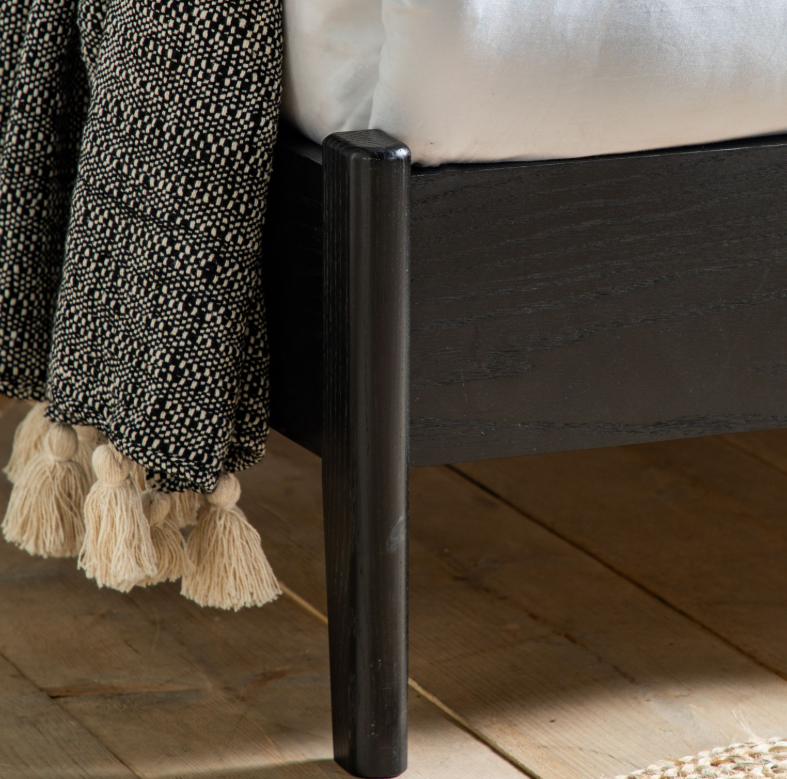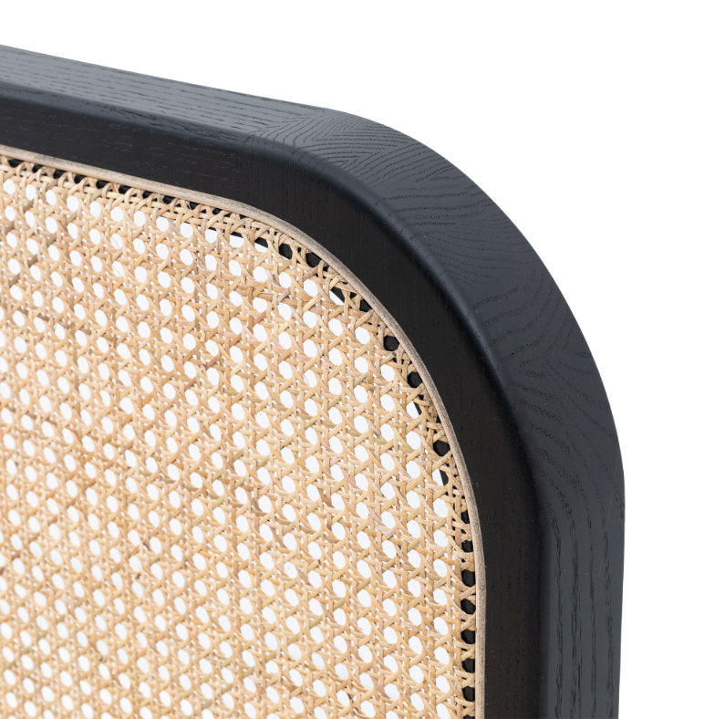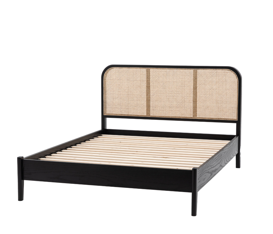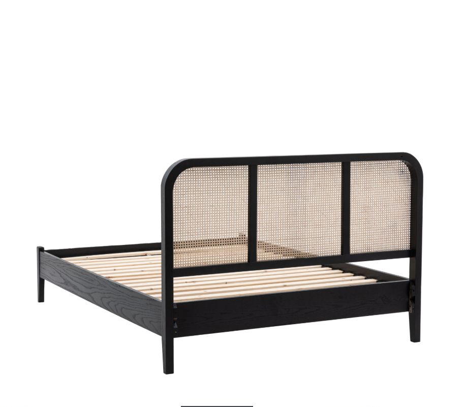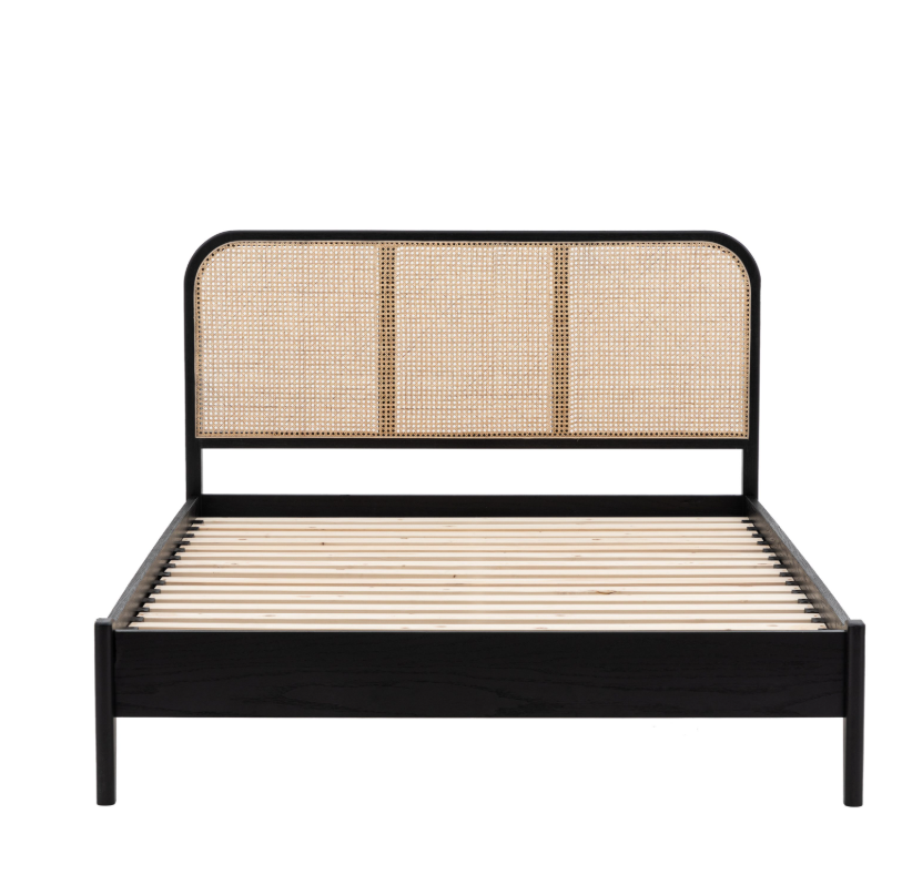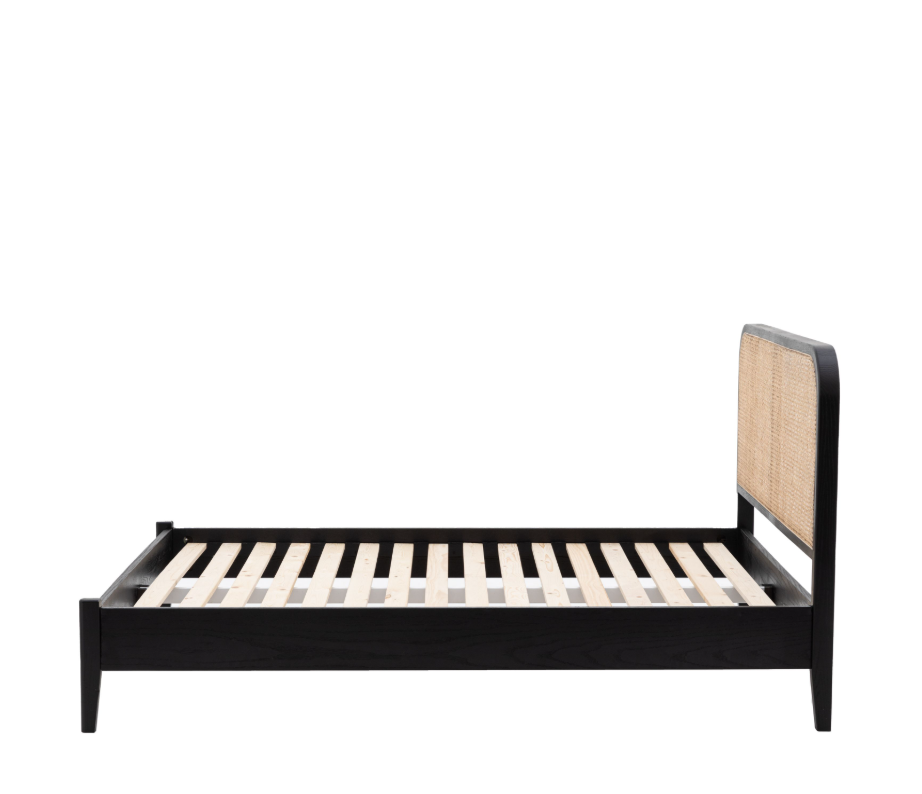 Łóżko Skylar 150cm z plecionką czarne prezentuje wyrazisty styl , który z pewnością stanie się nowoczesnym klasykiem. Solidna, czarna, dębowa rama łączy w sobie komfort i styl, a zaokrąglony narożnik z plecionym panelem z rattanu tworzy oszałamiający kontrast kolorów i materiałów.