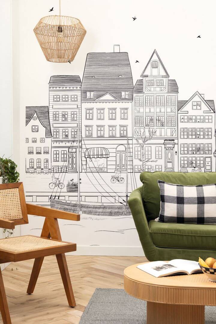 Mural CASELIO 104210901 Copenhague przedstawia przedstawia architekturę Kopenhagi . Ten czarno biały projekt wygląda jak szkic z notatnika architekta. To oryginalna dekoracja ścienna do pokoju dziecięcego. To świetne rozwiązanie na ścianę akcentującą również w pokoju młodzieżowym. Mural został wydrukowany na flizelinowym podłożu, które odznacza się większą elastycznością oraz odpornością na uszkodzenia podczas montażu.