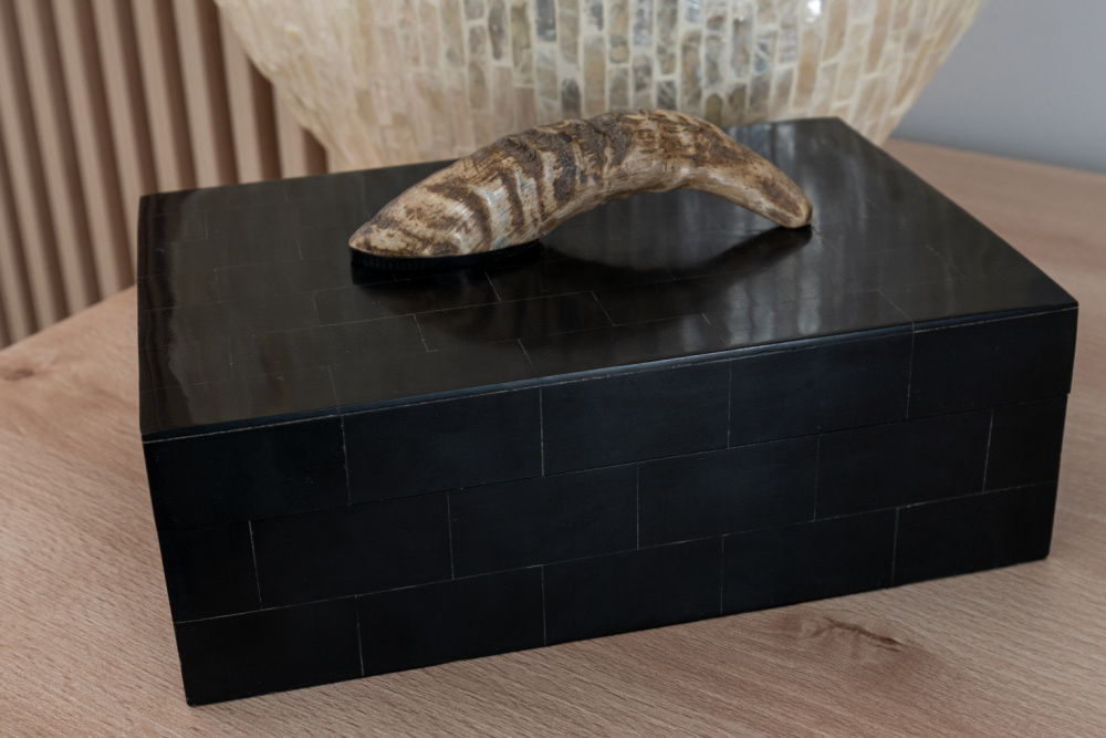 Przepiękne ręcznie wykonane pudełko drewniane z ozdobnym uchwytem wykonanym z rogu. Oryginalny przedmiot do przechowywania drobnych przedmiotów.