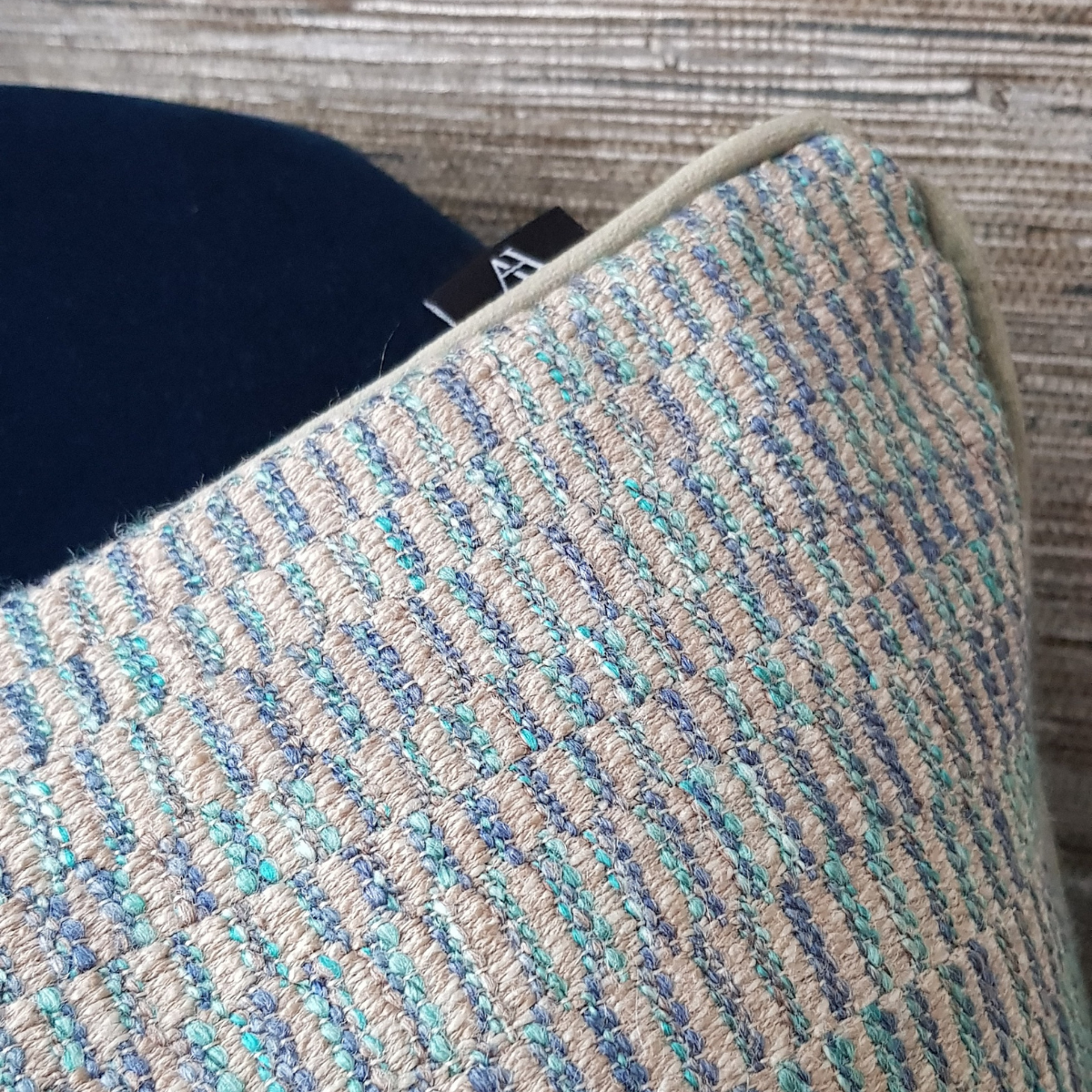 W sypialni jednak lepiej wyglądają większe 60×80 cm u wezgłowia jako tło dla mniejszych. Front poduszki- tkanina o wyraźnej fakturze jodełki w kolorze błękitnym. Spód poduszki -tkanina velur w kolorze jasno oliwkowym z ozdobnym sznurkiem w kolorze spodniej tkaniny. Wkład poduszki syntetyczny ale bardzo miękki. Poduszka posiada wszyty zamek kryty.