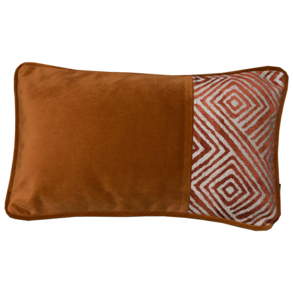 Poszewka dekoracyjna wykonana z weluru w kolorze pomarańczowym. Przód poszewki posiada dekoracyjną wszywkę z innego materiały w geometryczny wzór w podobnym kolorze. Cena za poszewkę ale dostępny jest wkład- miękkie poliestrowe wypełnienie poszewki w odpowiednim rozmiarze.