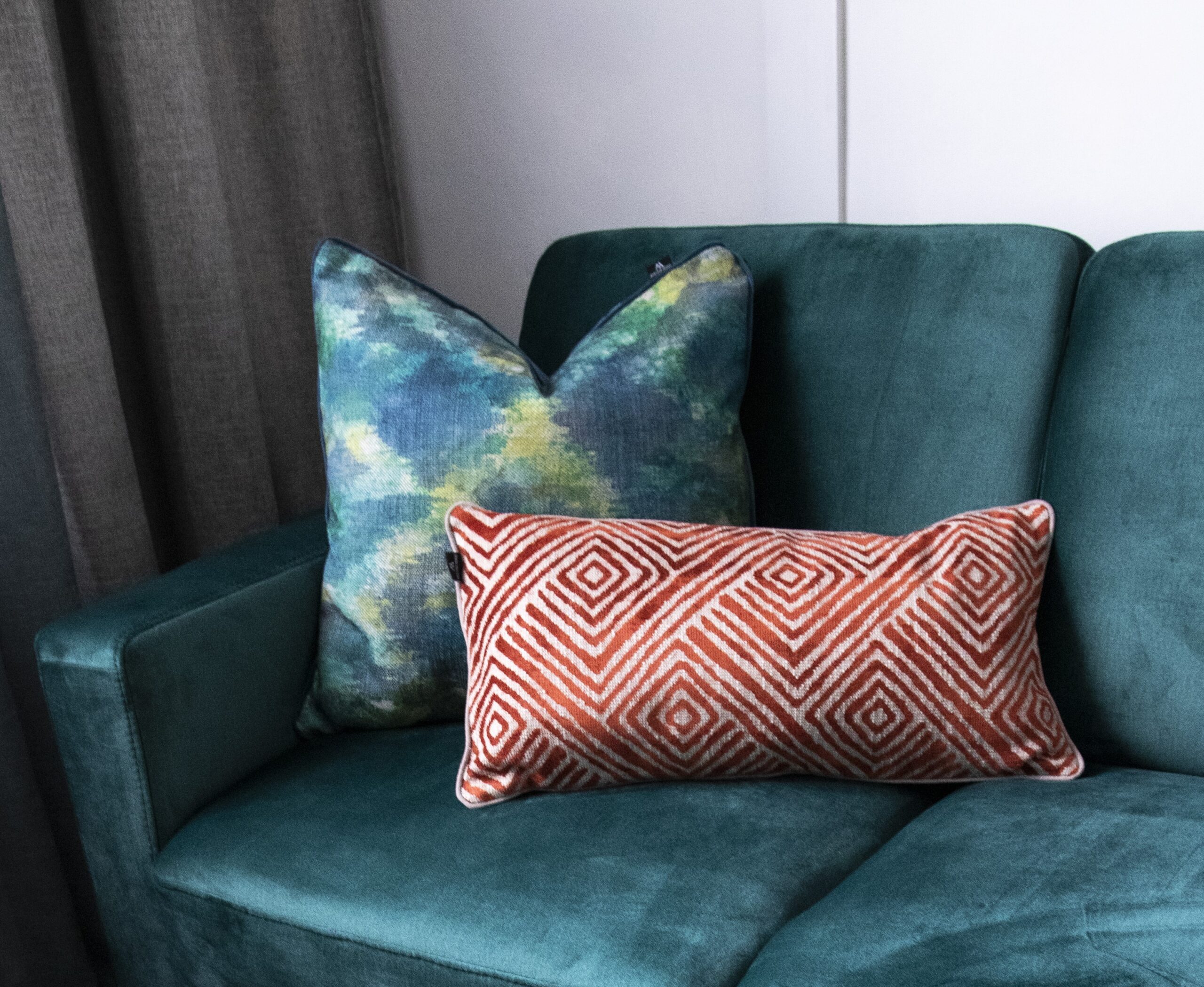 Poszewka DRAGONERA 08 pomarańczowa Front poduszki –tkanina dość gruba o wyraźniej fakturze w geometryczny wzór w kolorze pomarańczowo ceglastym na beżowym tle. Spód poduszki- tkanina o wyglądzie drobno tkanej wełny w kolorze beżowym z ozdobnym sznurkiem .