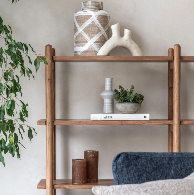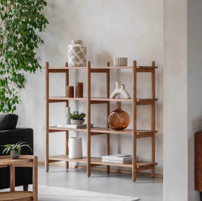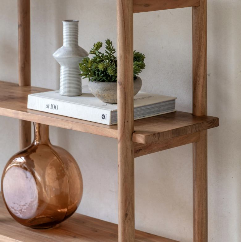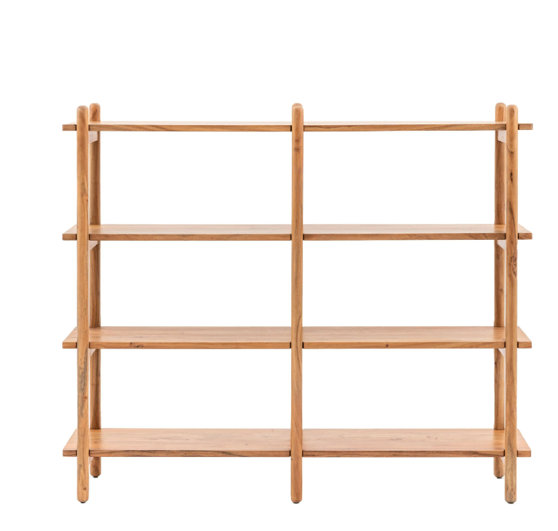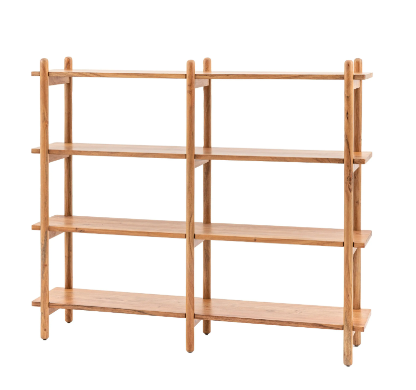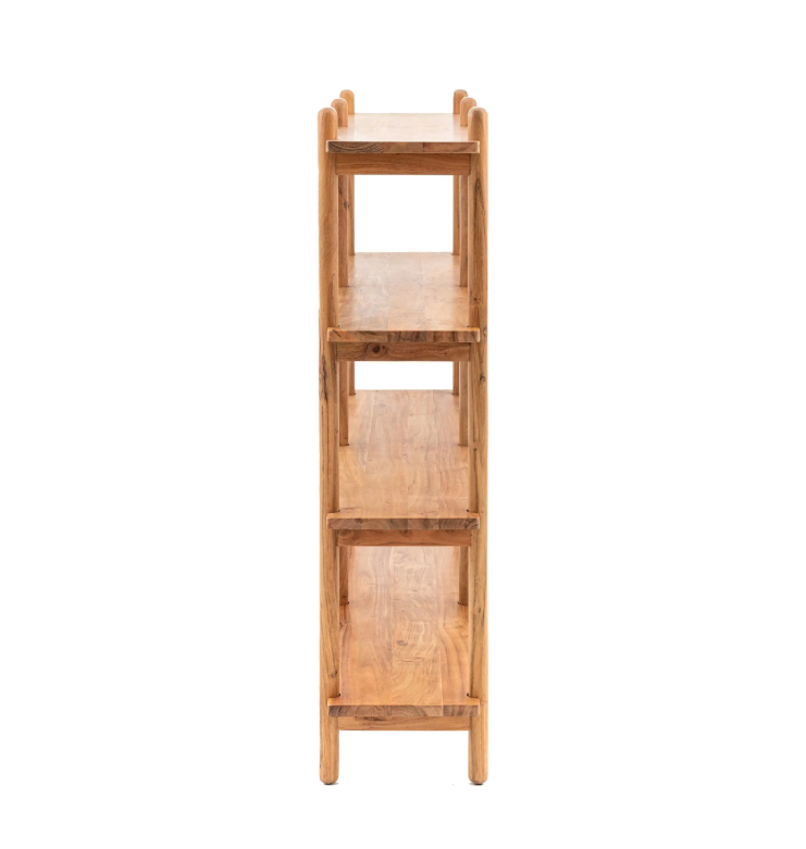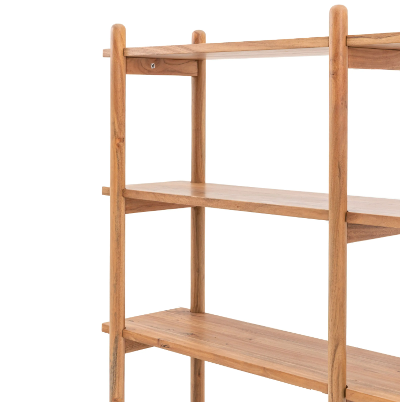 Dzięki otwartej konstrukcji, regał ten idealnie nadaje się do eksponowania kolekcji książek i ulubionych dzieł sztuki. Wykonana z szlachetnego drewna akacjowego, szeroka, czteropółkowy regał ma wyraźny wpływ styl vintage.