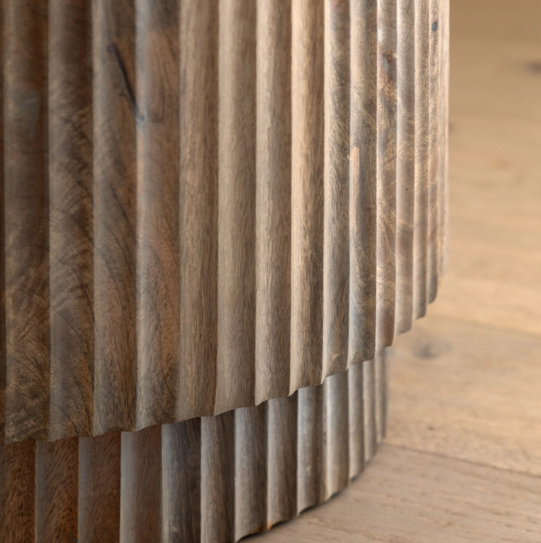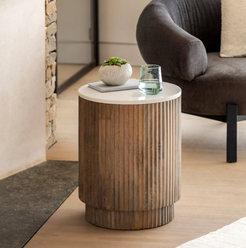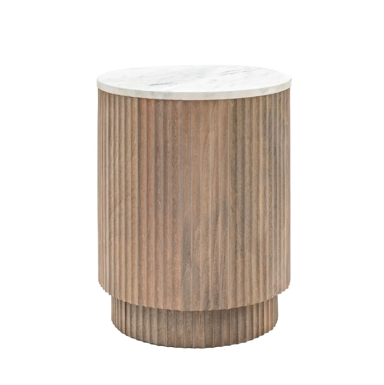 Ten zachwycający stolik boczny o nowoczesnym, klasycznym wyglądzie emanuje ponadczasową jakością i pięknem. Wykonany jest z litego drewna mango, z efektownym pionowym żebrowaniem. Posiada podstawę w kształcie bębna i polerowany blat z białego indyjskiego marmuru Carrera z klasycznymi szaro-niebieskimi żyłkami. Dostępne są pasujące elementy.