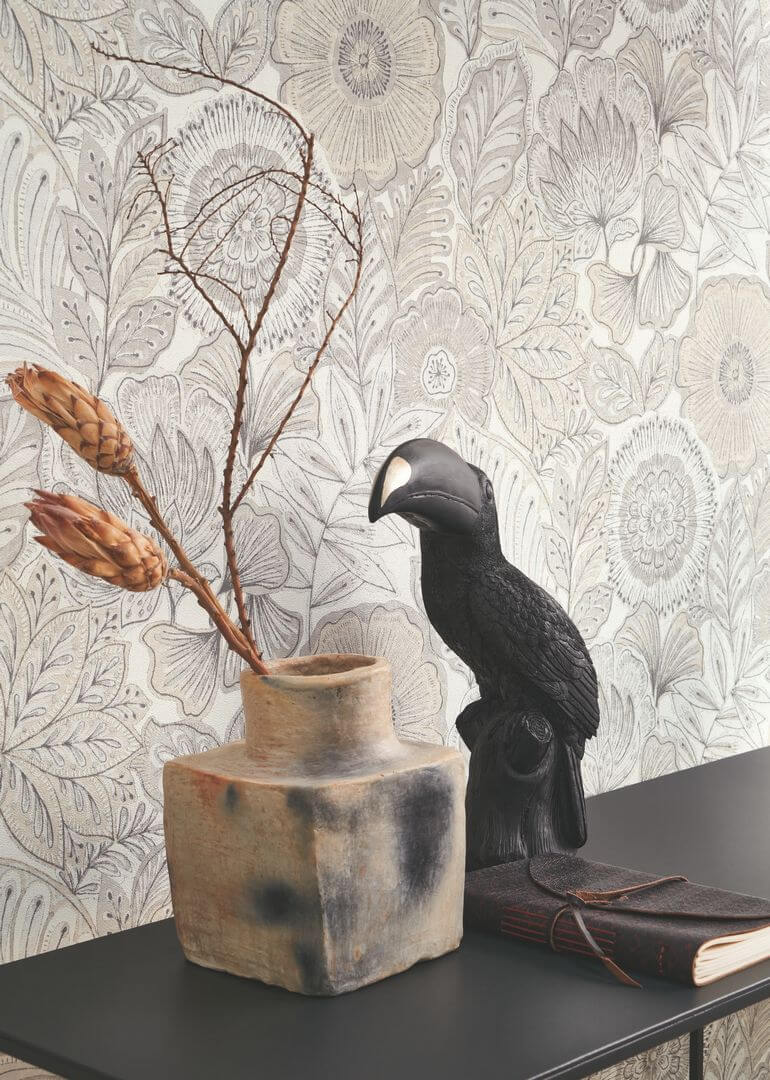 Tapeta w kwiaty i liście została zainspirowana tradycyjną techniką malowania na tkaninę – batik. Metoda ta jest osiągnięta za pomocą wosku, jest traktowana jak dzieło sztuki w warsztatach na wyspie Bali. Mistrzowska technika została przestawiona na tej przepięknej tapecie, która przeplata egzotyczne kwiaty i liście. Całość została ukazana na tle z efektem tekstylnym, dzięki czemu pomieszczenia staną się przytulne oraz przyjazne dla naszych oczu.