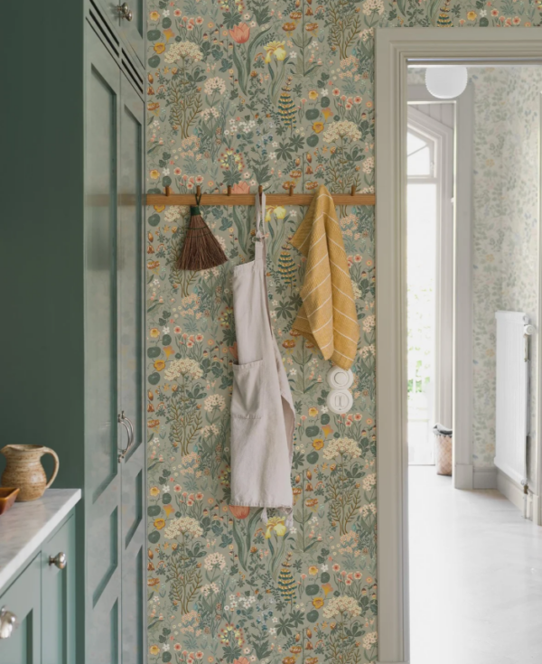 Wyobraź sobie małą kwitnącą polanę pośrodku spokojnej i przytulnej leśnej ciemności. Ta tapeta zaprojektowana przez Noomi Spange jest cudownie dramatyczna, bogata i żywa.